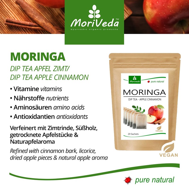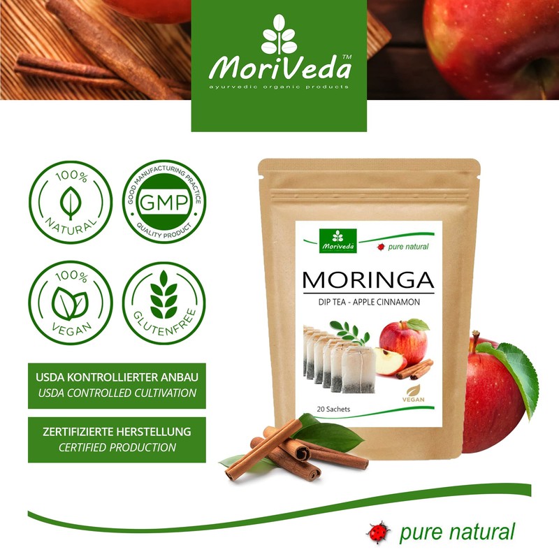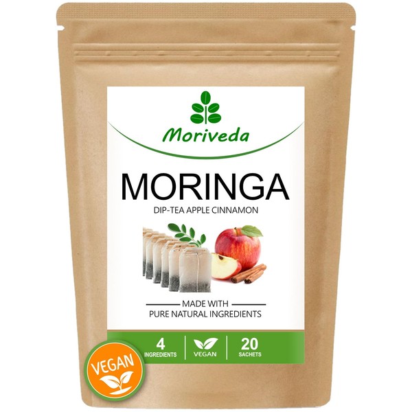 Moriveda (20 Bags MORINGA OLEIFERA Dip Tea 100% Natural, Vegan, 1 A quality moringa Apple Cinnamon)