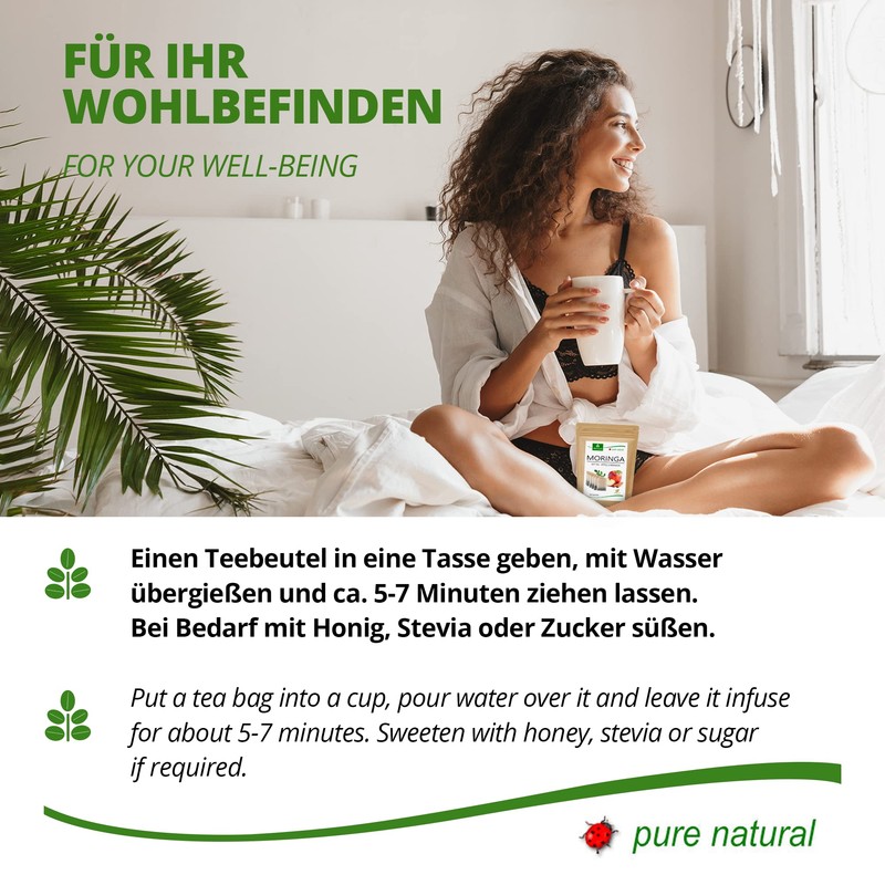 - Features: the Moringa leaves contained in our tea bags are gently processed, pure and natural from wild growth. Moringa can support weight loss and is digestible and healthy.