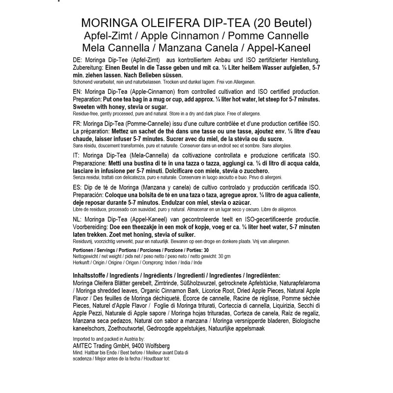 - Moringa tea: treat yourself to a break with a cup of moringa tea. The original Moringa Oleifera tea contains crushed leaves refined with cinnamon bark, licorice, dried apple pieces and natural apple aroma.