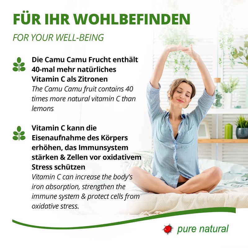 The small red berry is not only an unbeatable source of vitamin C (ascorbic acid), but also a true powerhouse of antioxidants, amino acids and minerals. In addition to vitamin C, Camu Camu also provides smaller amounts of potassium, calcium, zinc, magnesium, manganese and copper. Vitamins B2 and B3 can support the metabolism and have a positive effect on the regeneration of the skin. Natural, bioavailable vitamin C can increase the body's iron absorption, strengthen the immune system, thereby preventing fatigue and protecting cells from oxidative stress.