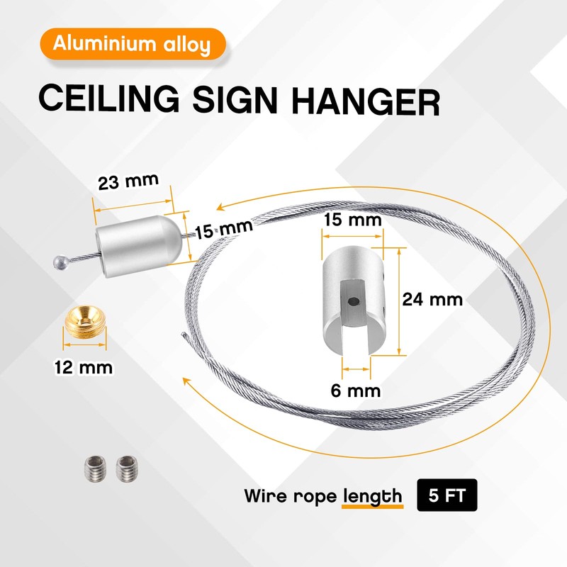 - Complete Package: this comprehensive package includes 4 top fixings, 4 sign holders, 4 wire ropes, 4 screws, 4 expansion, 1 wrench, easy to install and detach; Therefore, it encourages fluidity and efficiency; You are investing in an experience that ensures maximum convenience; The ceiling sign hanger's maximum panel thickness is 0.24", and the rated hanging weight is 4.41 lbs to 6.6 lbs/unit, load capacity may drop if installed on softer ceilings or materials