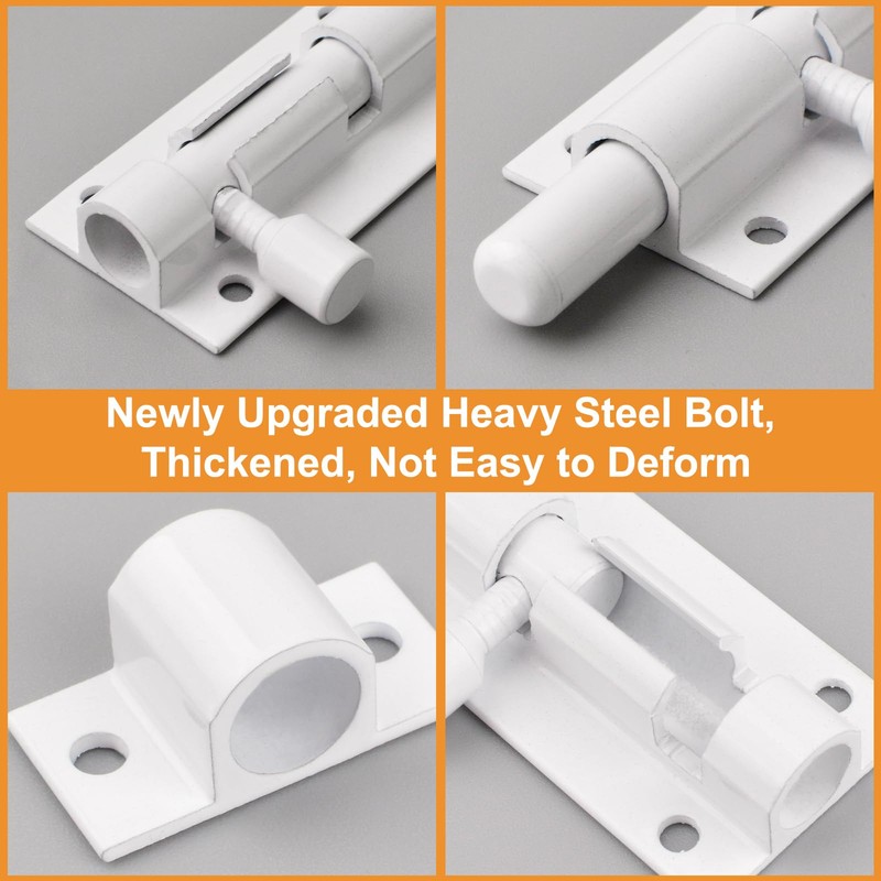 - 🔒【Strong & Durable】: The barrel bolt lock is made of high quality stainless steel. Our slide bolt latch used latest electroplating and polishing technology to ensure a perfect long lasting. White finish surface slide lock which improves corrosion resistance, enhance wear resistance and hardness, protects the metal surface and have a good insulation performance.