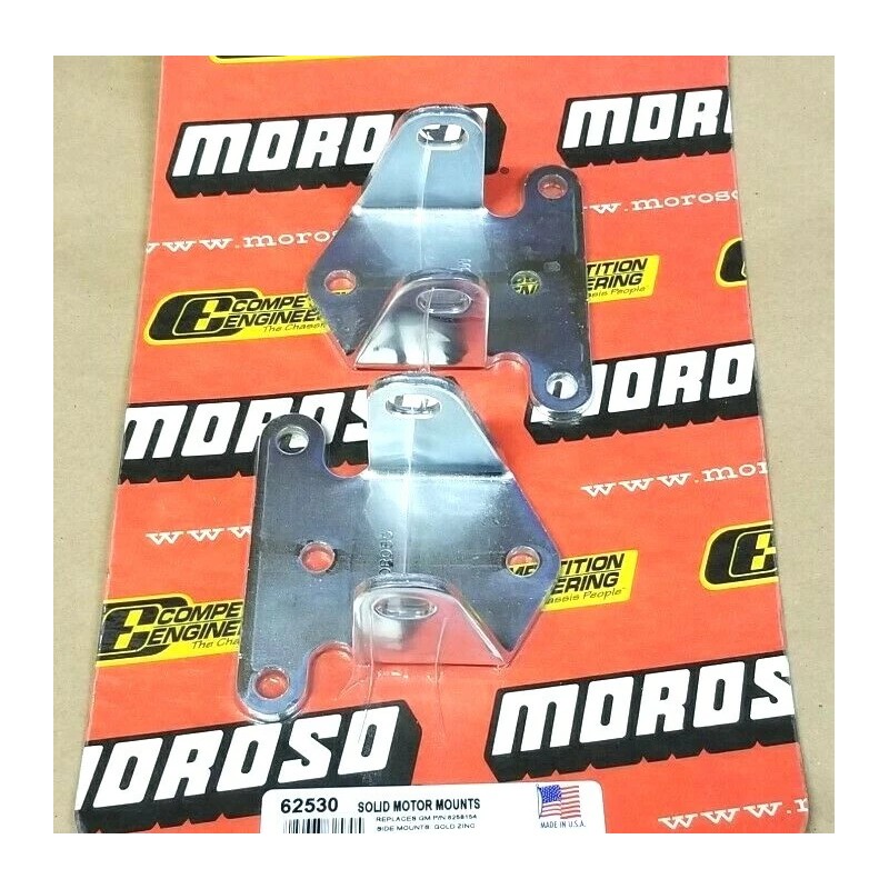 Moroso solid steel motor mounts replace stock, OEM-style rubber mounts to prevent torque loss and binding linkages, a common result of excessive engine movement. These solid steel mounts eliminate the need for bulky torque straps and chains and are covered with a protective zinc coating.