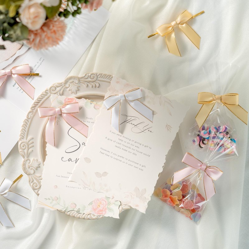 - The pre-tied small bows in a unique design are perfect for attaching candy bags, gift bags or decorative items. Each carefully handmade bow decoration is decorated with a unique golden decoration that makes the gift bow more elegant and elegant