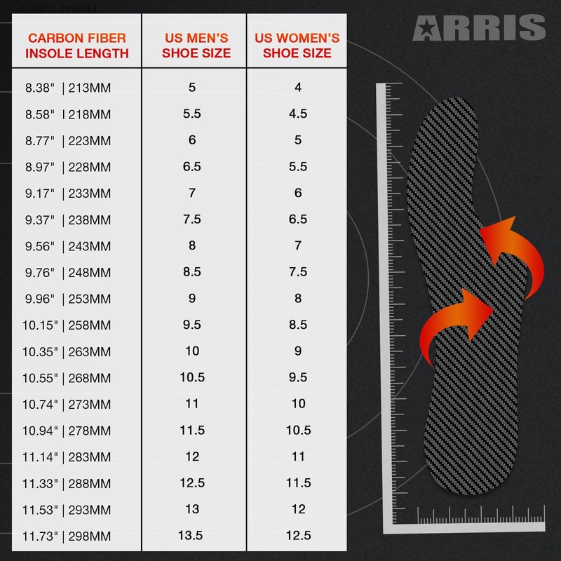 - ✅ PERFECT FIT - ARRIS carbon fiber foot plate is sold as SINGLE PIECE, not a pair. For proper fit,the rigid insoles must be ¼ - ½ inch shorter than removable insert in shoe to ensure that the carbon shoe insert does not exceed the length of your current insole. If in between sizes or half sizes round down to smaller size. NB: Please use this stiff carbon fiber shoe insert below your original removable shoe insole or under orthotic.