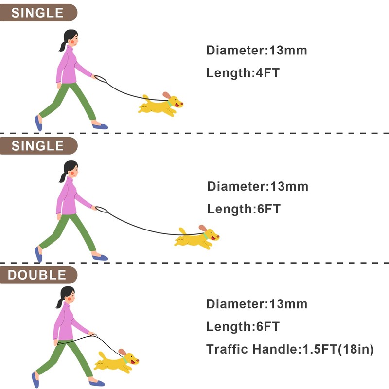 - 【Double Handle】Dog Leash with traffic handle gives you more control over your dog, and guide it through busy and crowded areas with ease. It offers an extra level of safety for your furry friends in an emergency situation. Our 6ft standard dog leash handle is great for walking, running, hiking or training, and is a perfect balance between freedom and control.