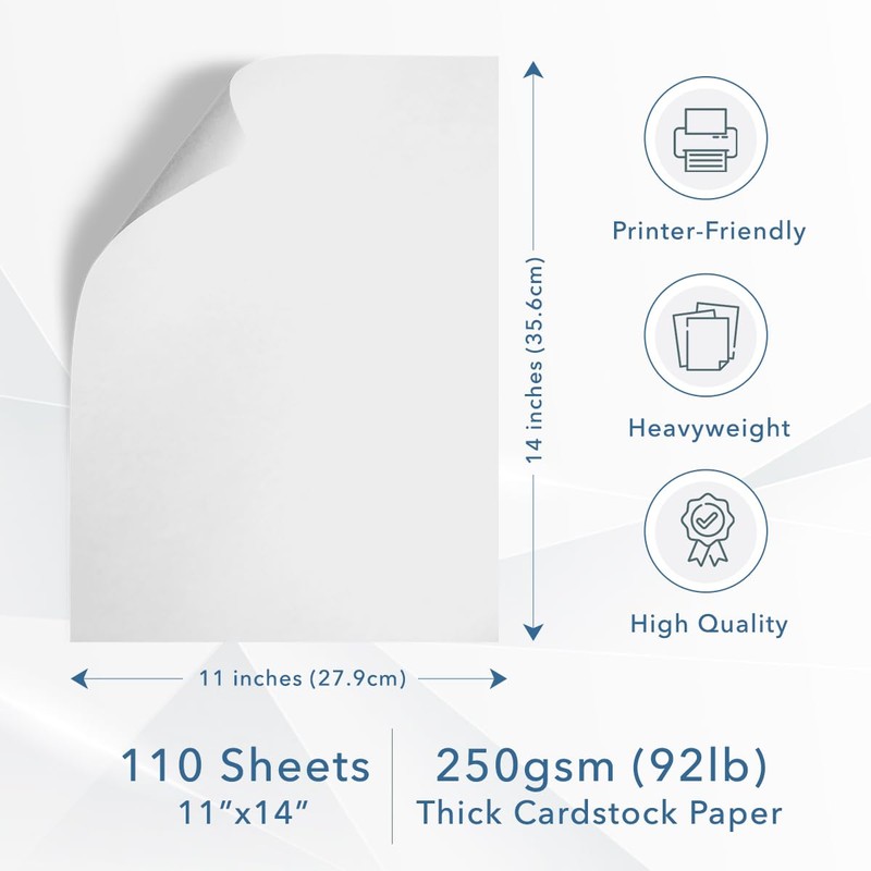 - Pack of 110 Sheets in Multiple Sizes: Get 110 sheets of premium white cardstock in Letter (8.5" x 11"), Legal (8.5" x 14"), and (11" x 14") - providing an ample supply for your printing, crafting, and business projects.
