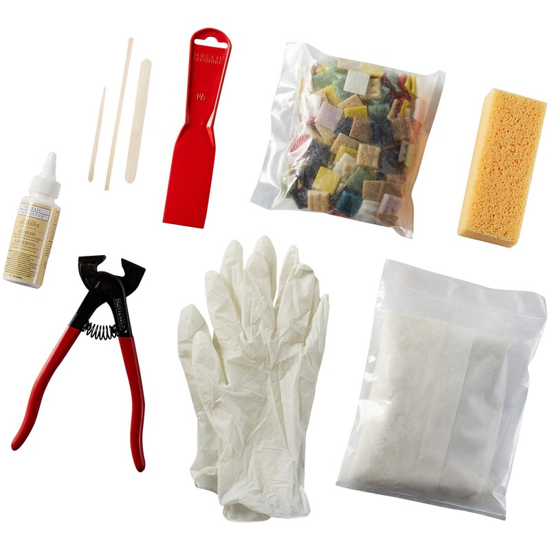 Contains: Our 1-pound Discount Assortment of of tile (Colored and Metallic), Adhesive (8-oz.), Snow White Sanded Grout (1-pound), Gloves and an Applicator Set. Comes with nipper. (Available with or without a Wheeled Nipper).