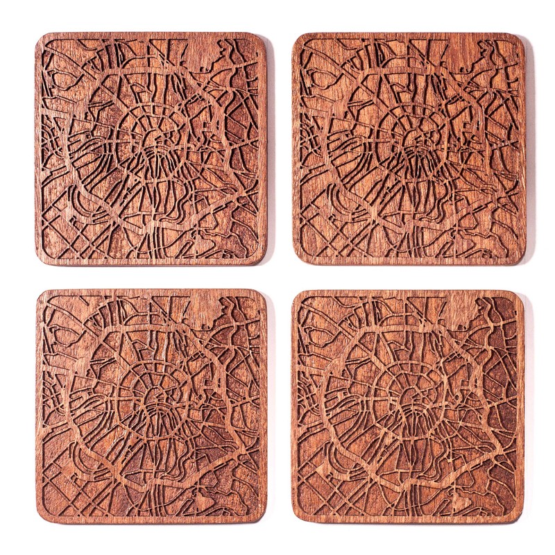 Moscow Map Coaster, Set of 4, Sapele Wooden Coaster with City Map, Handmade