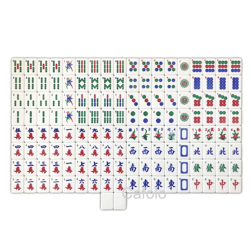 - Our mahjong set features both Arabic numbers and Chinese characters clearly engraved on the tiles, allowing for easy play for all levels. The set includes 144 tiles (36 Circles, 36 Bamboos, 36 Characters, 12 Dragons in red, green, and white, 16 Winds in North, East, South, and West, and 8 Flowers and Seasons), ensuring a complete and authentic experience.