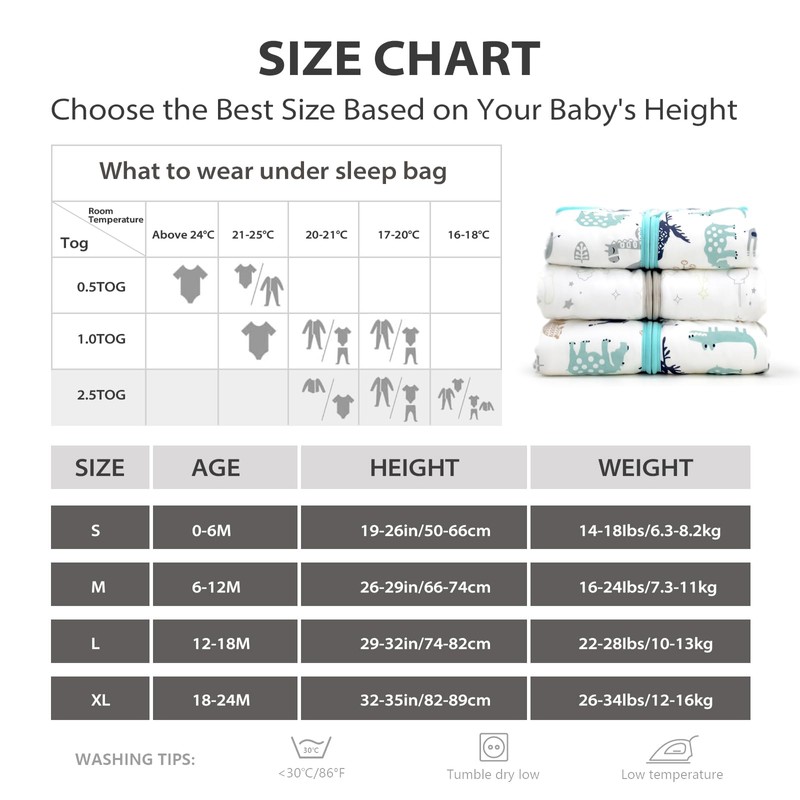 - Universal all year round: Our baby sleeping bag is 2.5 tog, super soft, comfortable with a sleeveless design and provides a wonderful sleeping state. It is suitable for room temperatures below 20 °C, so it can be used during all four seasons.