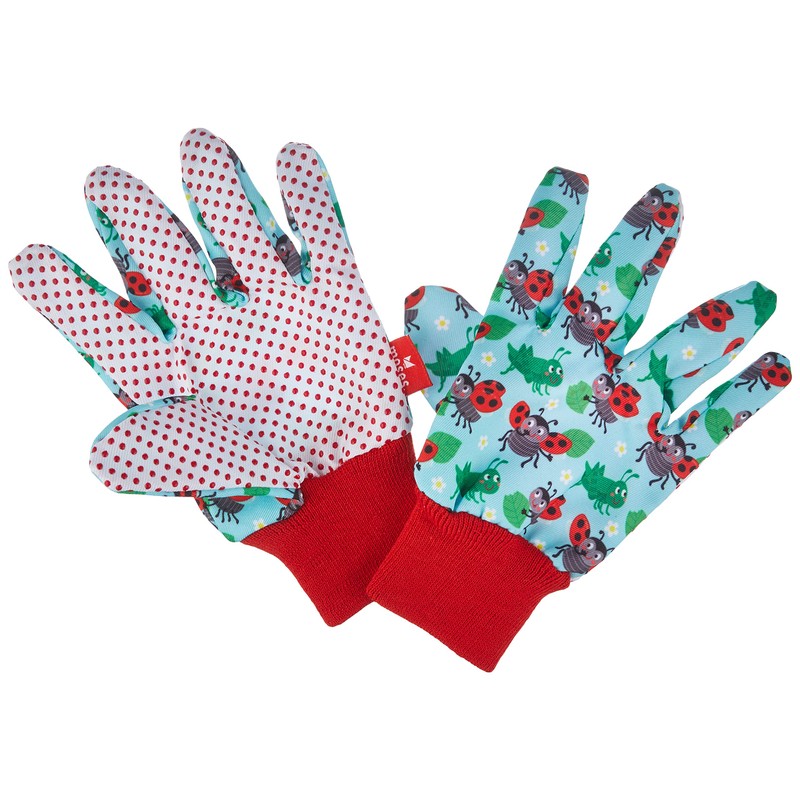 - Colourful and cheerful crawling beetle gloves for little gardeners with cute ladybird design.