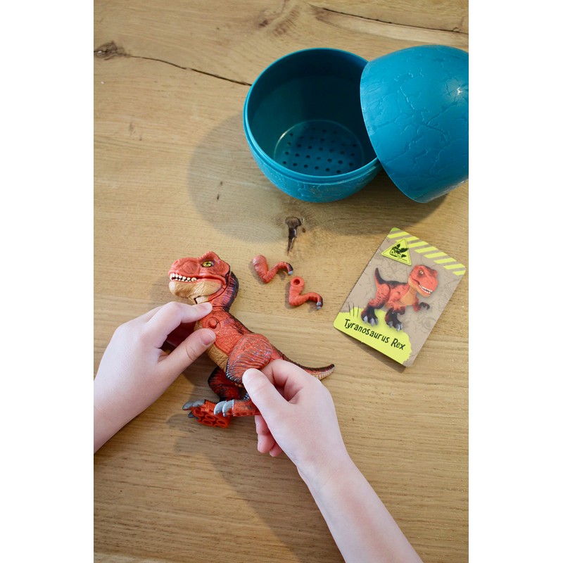 Equipped with small picture instructions, children need to assemble the 13-piece 3D puzzle into a T-Rex toy figure. In addition to the cool dinosaur figure with movable body parts for playing, the dinosaur egg contains a detailed profile with all the important information about the king of dinosaurs.