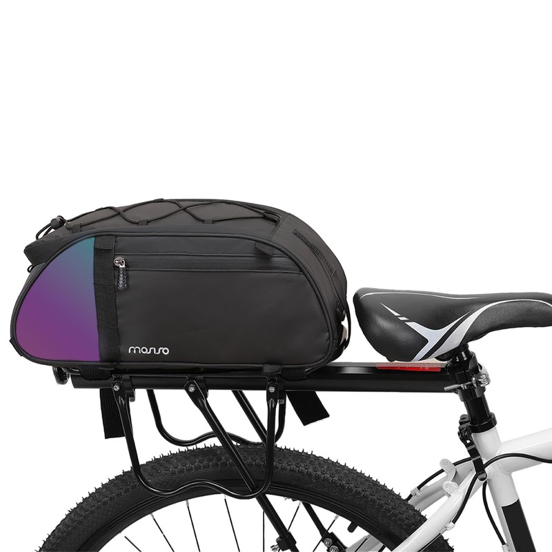 - This bike rack bag is made of waterproof polyester material, effectively prevent rain/water/mud/dust from entering this bag quickly. The end of the bike bag comes with reflective dazzle design, it can increase your night visibility, keep your night ride more safety.
