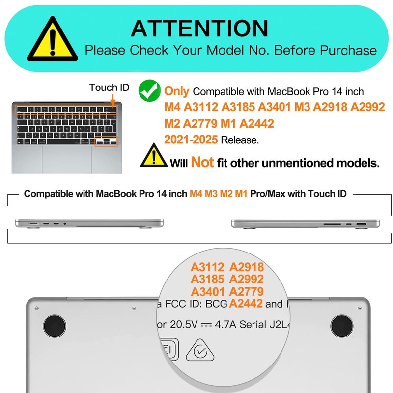 - Designed only for compatible with MacBook Pro 14 inch case 2025 2024 2023 2023 2021 release M4 Max / M4 Pro / M4 / M3 Pro / M3 Max / M3 / M2 Pro / M2 Max / M1 Pro / M1 Max chip with Liquid Retina XDR Display & Touch ID (Models: A3112 & A3185 & A3401 & A2918 & A2992 & A2779 & A2442) WARNING: This case is NOT compatible with other laptop models.