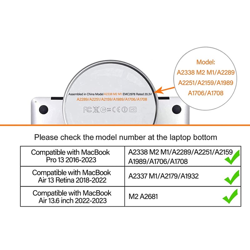 - Por favor, compruebe el número de modelo "Axxxx" en la parte posterior de la computadora portátil ANTES DE su compra, asegúrese de que coincida con el número de modelo en el título "A3113", "A2681", "A2337", "A2179", "A1932", "A2338", "A2251", "A2289" , "A2159", "A1989", "A1706" o "A1708". ADVERTENCIA: Este funda NO es compatible con otros modelos de portátiles.