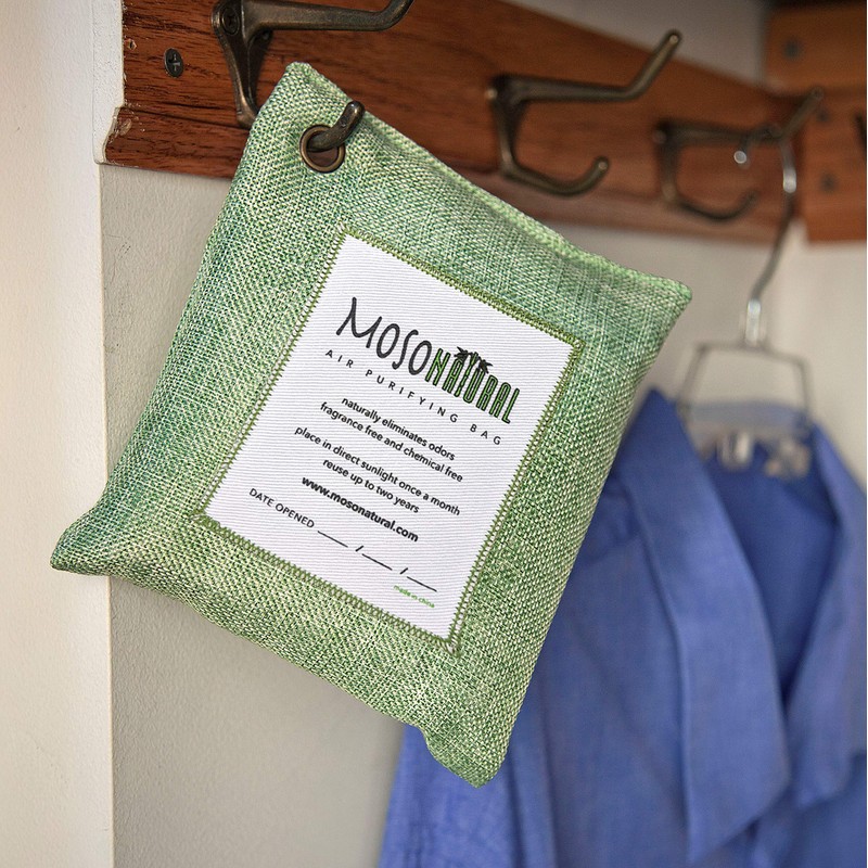 - ▶ Moso Natural Air Purifier Bag is safe and requires no ventilation, and is made of premium quality 200g porous, stylish and lovely burlap fabric to create the easiest and dry unscented space for your entryway, drawing room, nursery, toilet, drawer, closet, closet, closet, closet, closet, closet, kitchen, trash can, shoes, shoe cabinet, running shoes, shed, and clean in your car. The deodorizing effect is comparable to Binchotan charcoal, silver, and ions, and has been tested by the Japan Food Analysis. The stationary Moso bag also has a hanging hole (ring) attached in the upper left corner for your convenience. Also effective for deodorizing cats and dogs