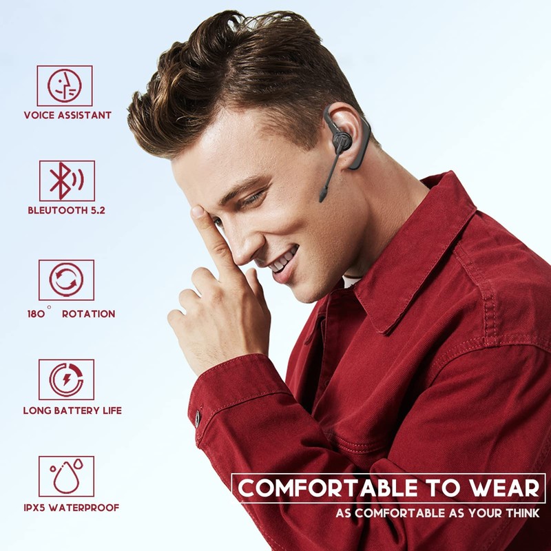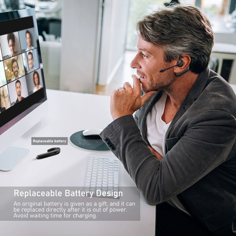 [Comfortable wearing design] The bluetooth earpiece weighs only 0.02 pounds, the bending angle is ergonomic, the unique ventilation hole design is not stuffy, and there is no discomfort even if you wear it for a long time. The 180°+270° rotatable bluetooth headset is suitable for wearing on the left ear and can be easily used even by left-handed people.;[Battery Replacement Technology] The bluetooth earpiece uses a battery replacement design. After the power is exhausted, the new battery can be used in time, without worrying about the trouble of waiting for charging when the bluetooth headset with microphone is out of power. Make sure your work meeting or phone chat is enjoyable. The fast charging technology guarantees a full charge in 1.5 hours, and the two batteries support 20 hours of continuous use. Comes with an original battery.;[Bluetooth 5.0] The bluetooth earpiece is equipped with Bluetooth 5.0 technology, which still provides low latency and stable connection even in complex environments, no signal or music loss at 33 feet away. The bluetooth headset will automatically connect to the device after power on. The bluetooth headset with microphone can be connected with two devices simultaneously, separate work calls from home calls.;[CVC 8.0 & Hand-free] The bluetooth earpiece adopts CVC 8.0 technology. Eliminates loud background noise during calls, so the voice during the call is clear to you and the other end, no matter what environment you are in. The incoming call will automatically broadcast the number, tap the function key to answer the call, and long press to reject the call.;