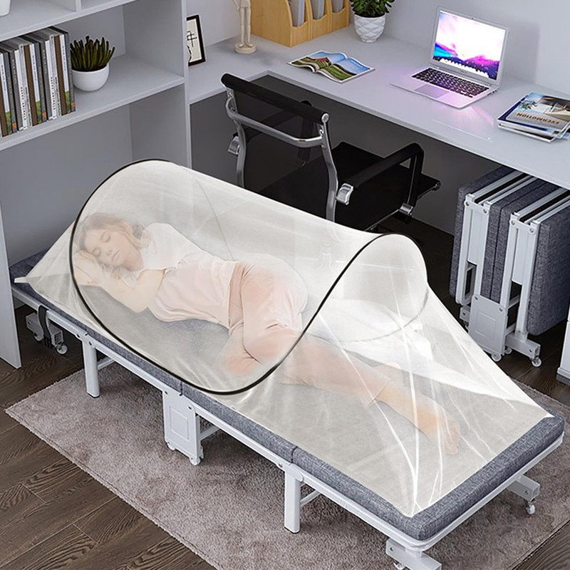 1. The mosquito net bed is equipped with a convenient zipper for easy access and secure closure. The zipper ensures that no insects can enter while you can easily get in and out. This pop-up mosquito net combines protection and comfort in one.