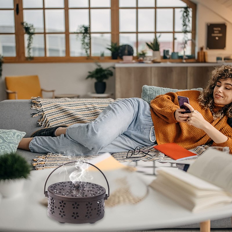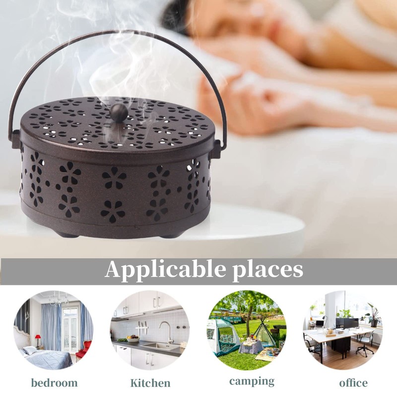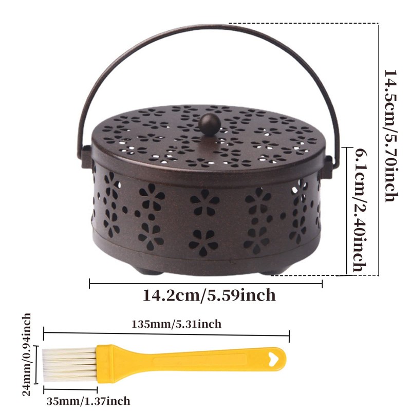 - High Quality Material This mosquito coil holder is made of metal with good heat insulation. It is the best partner for daily use. Product Specifications The size of the incense box is approx. 15 x 15 x 21 cm. With a portable handle that allows you to move anywhere. With brush for easy cleaning.