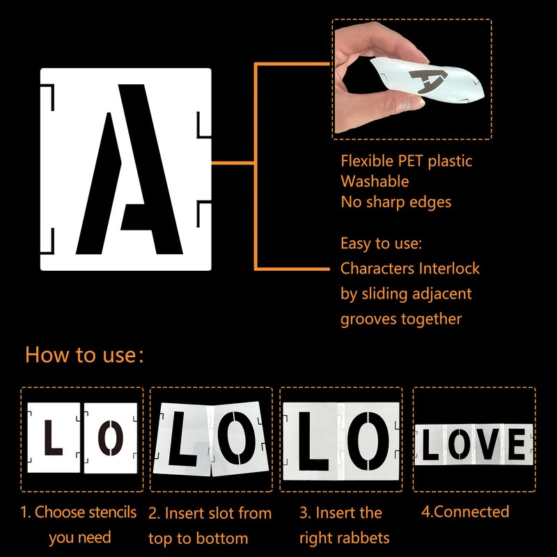 - 【Quality Material &Interlocking Design】: Letter Stencils are made of high-quality eco-friendly PET material, durable for you to use. They are cut by laser, and there is no sharp edges, which is safe for everyone. With interlocking design, those art stencils are easy to align for quick and precise painting.