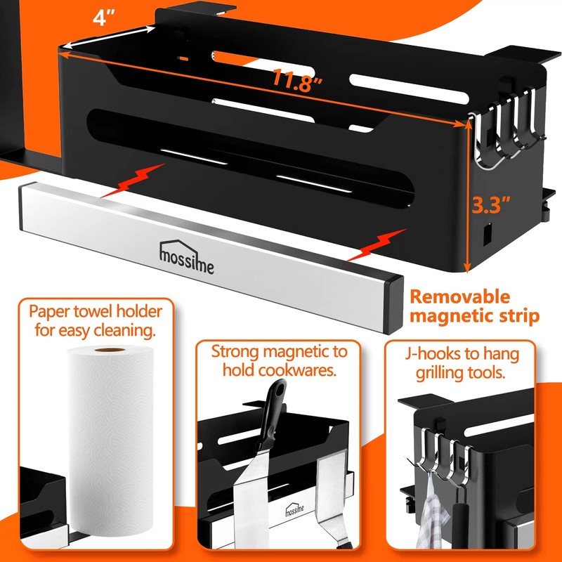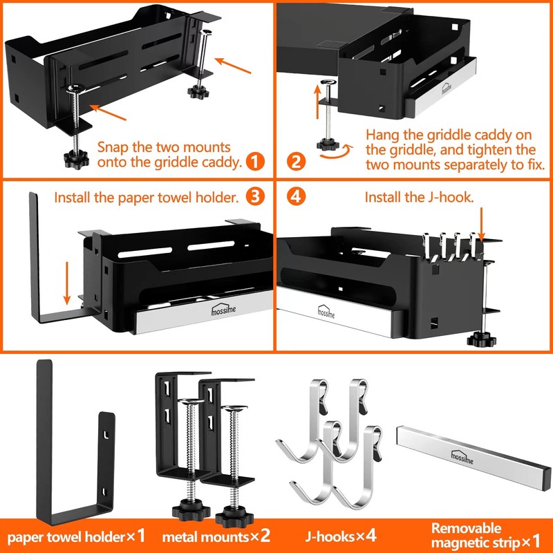- Effortless InstallationFirst of all, only need install the mounting clamps on your Blackstone griddle's side shelf by hand, then twist and tighten the 2 metal mounts and hang the grill caddy, secondly, mounting the magnetic bbq contact tool holder and J-hooks . The whole process only takes 2 minutes. Place your barbecue tools safely, save space, and be efficient and tidy. Better absorb and hold your griddle accessories so that they won't fall off easily.