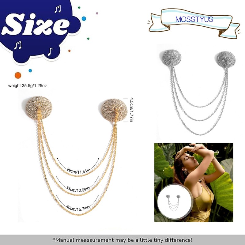 MOSSTYUS Women Rhinestone Nipple Pasties Sticker Chest Cover Tassel Breast Pads Invisible Sticky Adhesive Bra Body Chain,Silver A