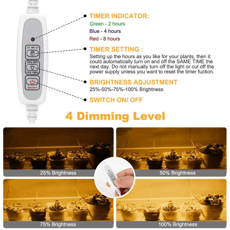 - Grow Lights with Auto Turn On / Off Timer Everyday - This led grow light strips can be set up to turn off after 2H/ 4H/ 8H. After you set up the hours, do not manually turn off the light and it will automatically turn on at the same time the next day- TAKE CARE OF YOUR PLANTS EVERY DAY