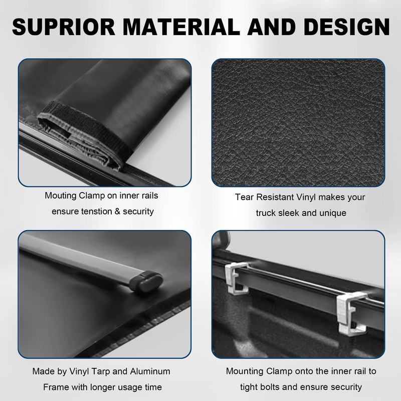 - High Quality: Made by Vinyl Tarp and Aluminum Frame. Ajustable coverage with secure strap on truck bed, Leaves No Space.