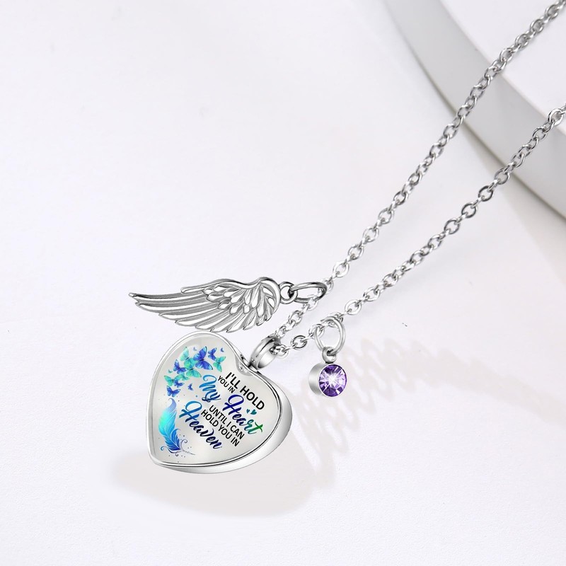 - Each cremation necklace comes with birthstones and angel wings charm.Color printing "I"ll Hold you in Heart until I can hold you in heaven". Comes with a funnel kit, help you put ashes in easily.