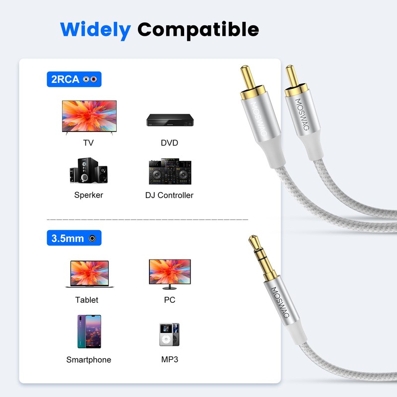 - 【2RCA to 3.5mm Cable】 3.5mm to 2 RCA stereo cable is great for connecting portable audio devices, such as a Smartphone , MP3 player or tablet to a stereo receiver, Speaker, Amplifier, TV, Car and other RCA-enabled devices