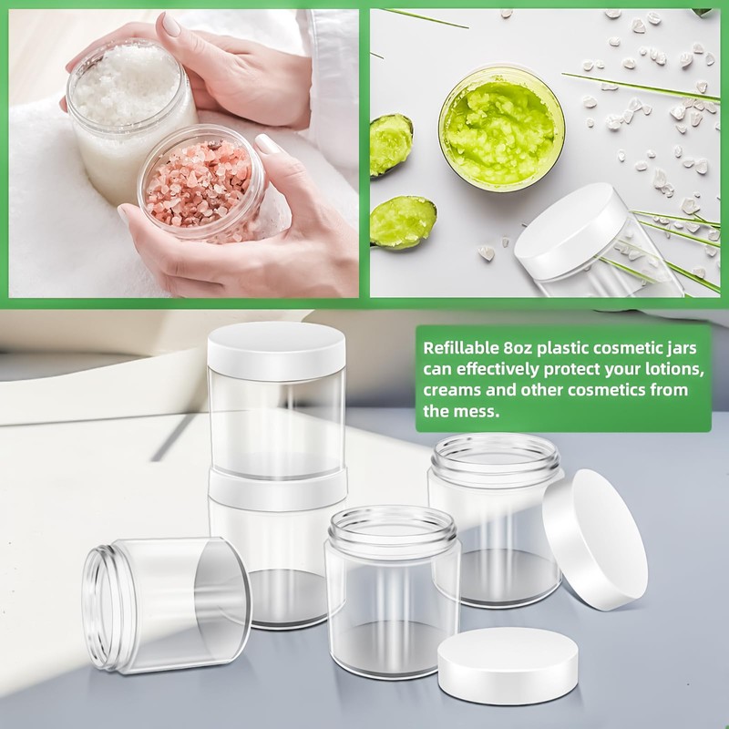 - Features: Refillable 8oz plastic cosmetic jars can effectively protect your lotions, creams and other cosmetics from the mess.The clear body of the jar allows you to better distinguish what items are stored inside,and blank labels are included in the package to help you better personalise,distinguish items and record dates,making it a good choice for our daily storage