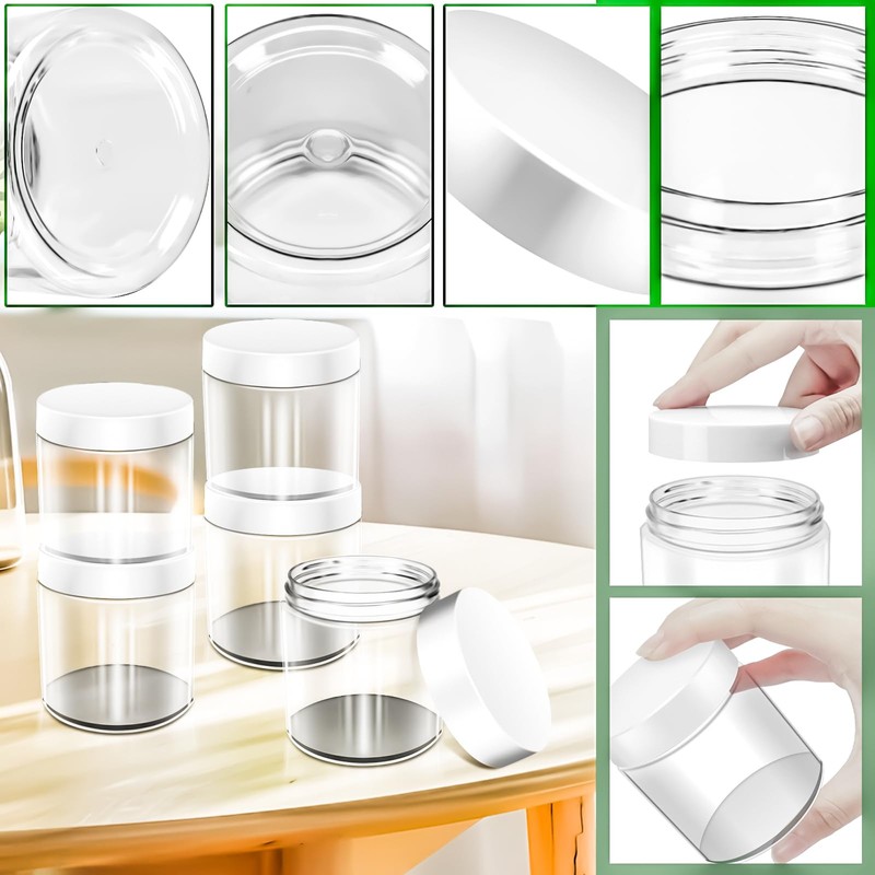 - Leak Proof: Each 8 oz plastic cosmetic container features a round srew lid to create a tight seal and will not leak. Easy to screw together and compact storage. It is very inconvenient to carry a large volume of cosmetics and skin care products when travelling.You can dispense them in our small jars and take them in your tote bags, handbag, back pack,gym bag and luggage,portable size allows them to go anywhere,very convenient