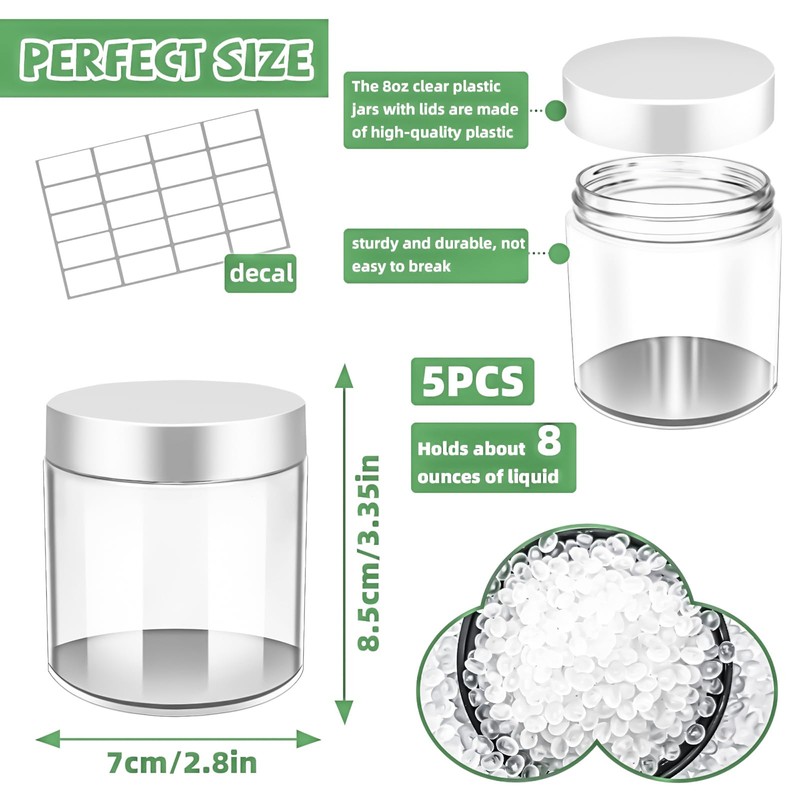 - Material: The 8oz clear plastic jars with lids are made of high-quality plastic, sturdy and durable, not easy to break, can be used for a long time, convenient to carry and you can rest assured that the use of traveling.The desigen of straight-sided and wide-mouth makes it easy and convenient for you to fill and remove