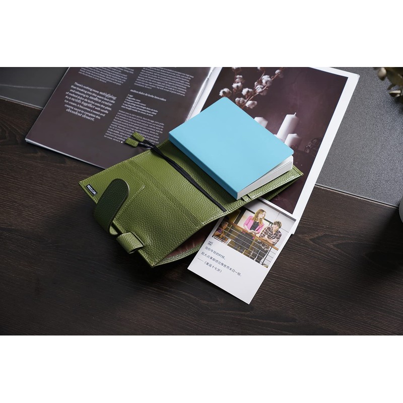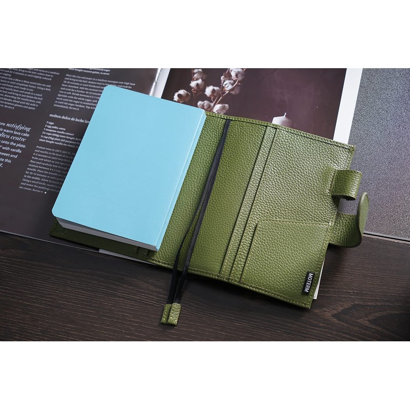 Moterm Leather Cover for A6 Notebook - Fits Hobonichi Cousin, Stalogy and Midori MD Planner, with Pen Loop, Card Slots and Back Pocket (Pebble Olive Green)