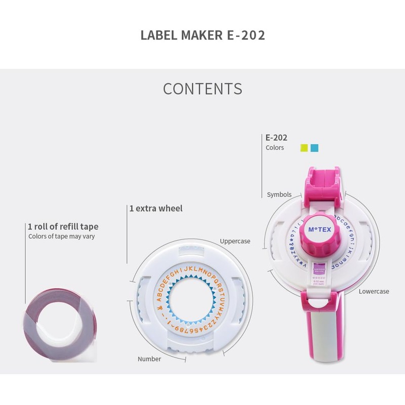 • Comes with 1 label maker, 1 pre-loaded tape and 2 wheels (Alphabet & Number & Emoticon)