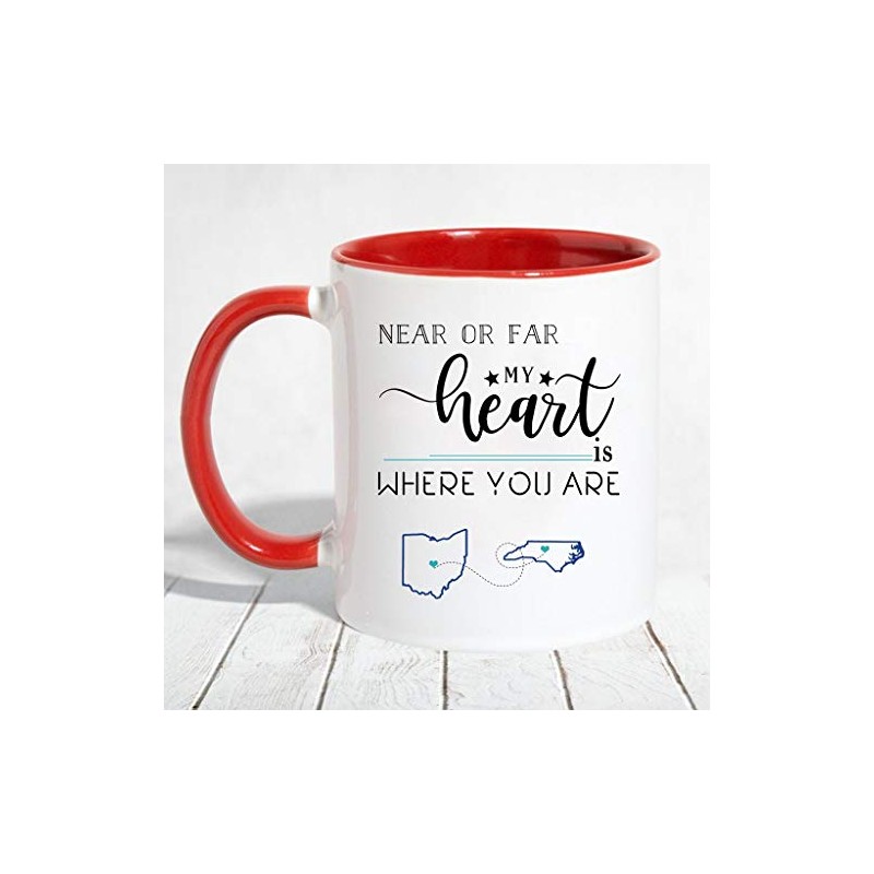 Mother Day, Father Day Gift Distance Mug - Near Or Far My Heart Is Where You Are - Long Distance Mug State Map (OH NC) Ohio North Carolina - Accent Mug 11 OZ (Red)