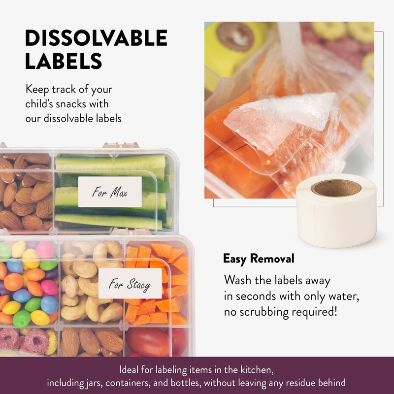- 100 Dissolvable Labels: Keep track of your child's snacks with our dissolvable labels that wash away in seconds with only water, no scrubbing required. The snack box set includes a roll of 100 high-quality sticker labels to ensure easy organization and leave no residue behind.