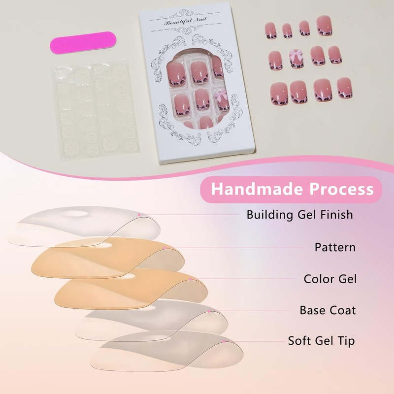 MOTIBACK French Tip Leopard Press on Nails - 24Pcs Short Square False Nails with 3D Bow, Reusable Stick on Nails for Women