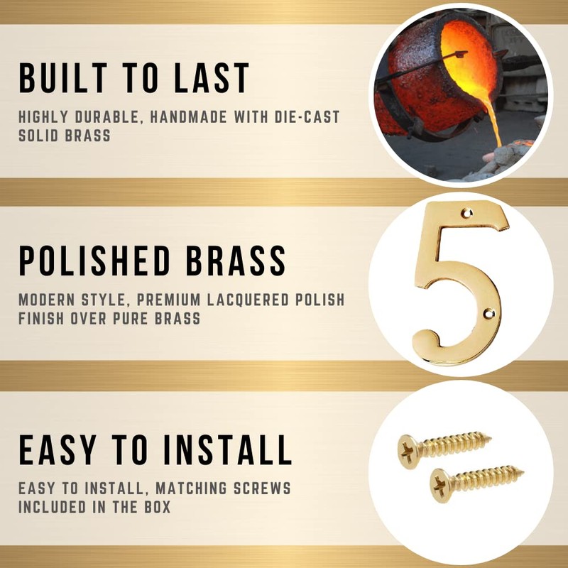- House numbers for outside modern, adress sign numbers: These metal house numbers in brass look stylish on vintage, modern, or mixed-style homes; They add curb appeal to nearly any design and they are heavy duty to last for many years; Handmade using Die-cast solid brass, not cheap hollow alloys.