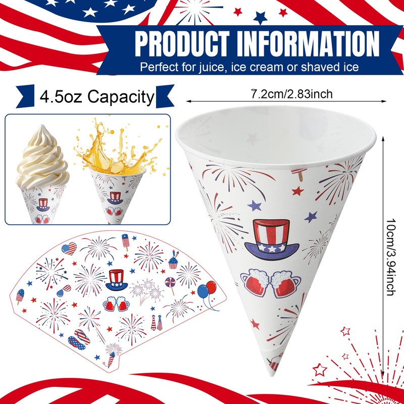 - Vibrant Pattern Design: our snow cone cups are printed with Independence Day patterns, such as fireworks, American flags, balloons, ice creams, classic and elegant, colorful and vibrant, helping to create a lively atmosphere at patriotic parties and celebratory activities on Independence Day. Besides, snow cone cups fit together well, the cone shape making them easy to store