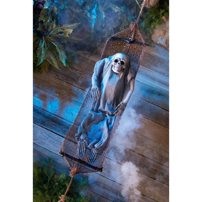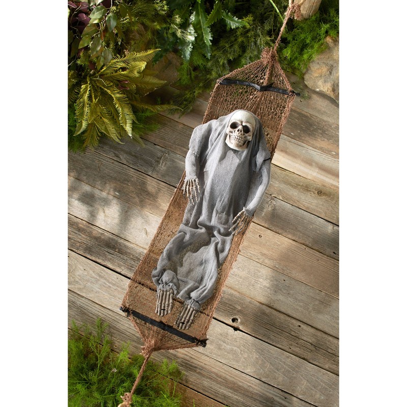 - Add a delightfully spooky element to your outdoor landscaping with this hammock decoration with a skeleton. Place it on the porch or suspended from a tree.