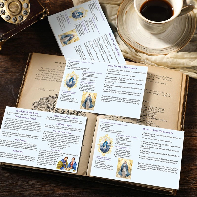 • Exquisite Design: the Rosary guide booklet carries an intricate design that beautifully embellishes images of the Holy Mary and Jesus; The texts are printed clearly, making it elegant to look at and comfortable to read; The multi-hued design on top-grade card paper material reveals an artistic balance between the vivid colors and sacred imagery, making every card a true masterpiece