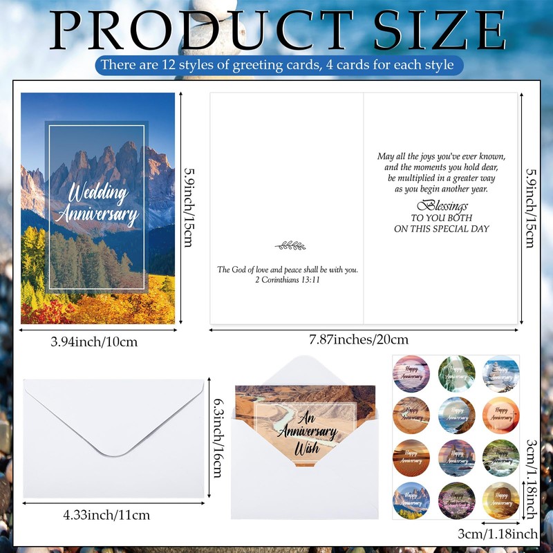 - Packaging Includes: our package contains 48 sets of anniversary cards, envelopes, and stickers; Our cards are thoughtfully designed, divided into 12 exquisite designs, with 4 cards of each design, offering you plenty of choices; These envelopes come with adhesive for easy sealing