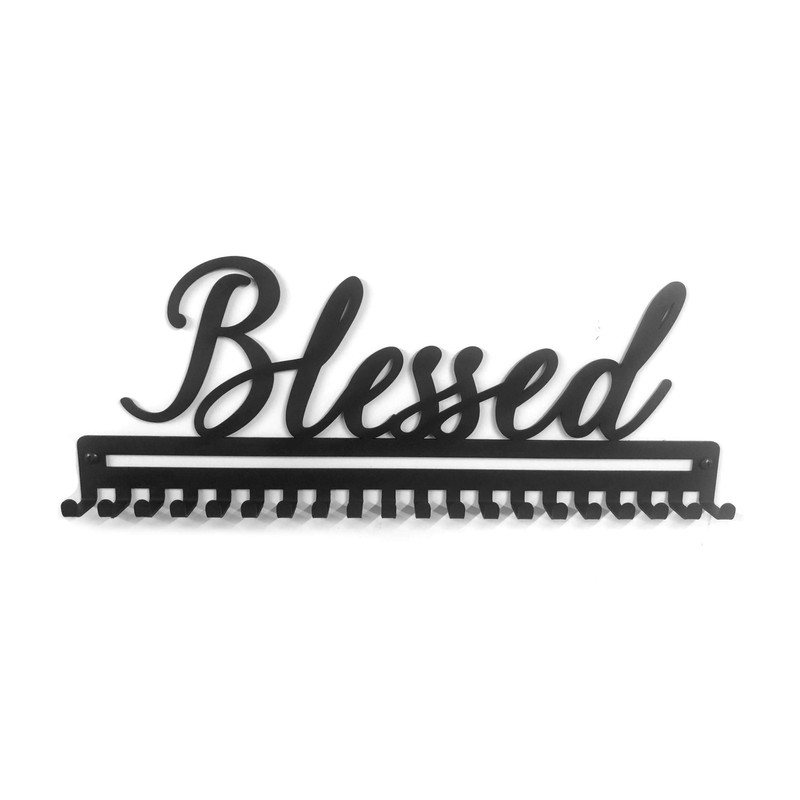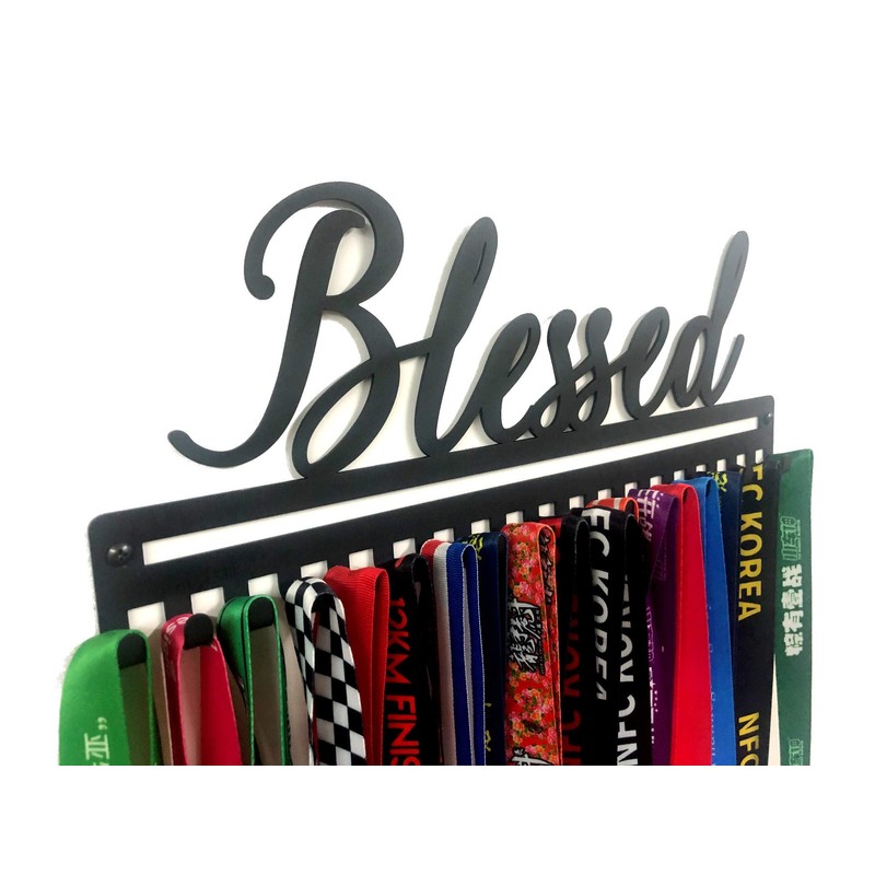 Show off your hard work and accomplishments with pride on this easy to hang ribbon medal hanger. his sturdy metal frame holder is a great way to display case your ribbon medal trophy collections and its unique design creates a great wall display rack for your collection of sports medals. Whether you run marathons or shorter races, play basketball, soccer, tennis, football, swim, or play any other sport, this wall mounted display is a great addition for any athlete. The motivational "BLESSED" wording make this a perfect gift for anyone.