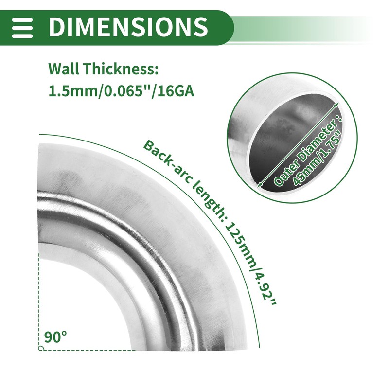 - Feature:Pipe Type: 90 Degree Bend Elbow; Outer Diameter: 45mm/1.75"; Back-arc length: 125mm/4.92"; Wall Thickness: 1.5mm/0.065"/16GA