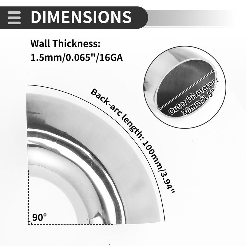 - [Feature]:Pipe Type: 90 Degree Bend Elbow;Outer Diameter :38mm/1.5";Back-arc length:100mm/3.94";Wall Thickness:1.5mm/0.065"/16GA