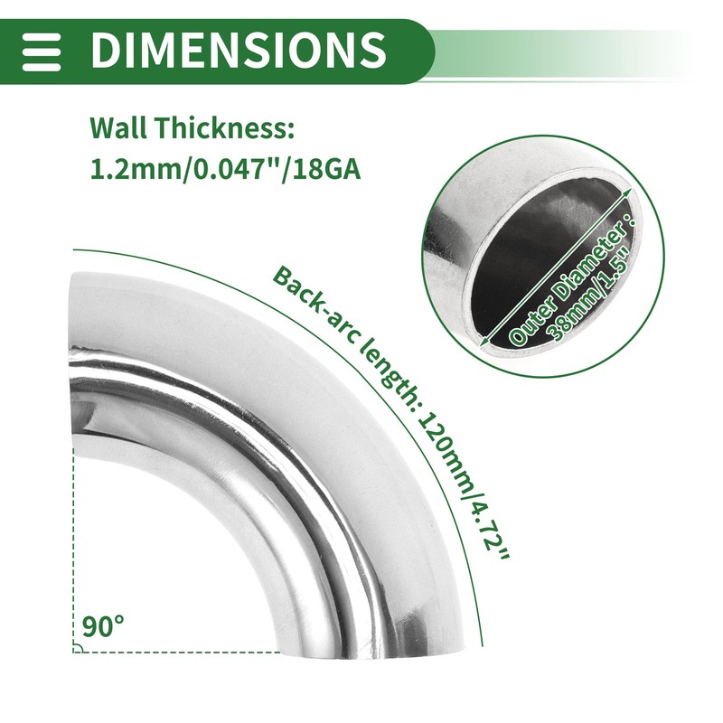 - Feature:Pipe Type: 90 Degree Bend Elbow; Outer Diameter: 38mm/1.5"; Back-arc length: 120mm/4.72"; Wall Thickness: 1.2mm/0.047"/18GA