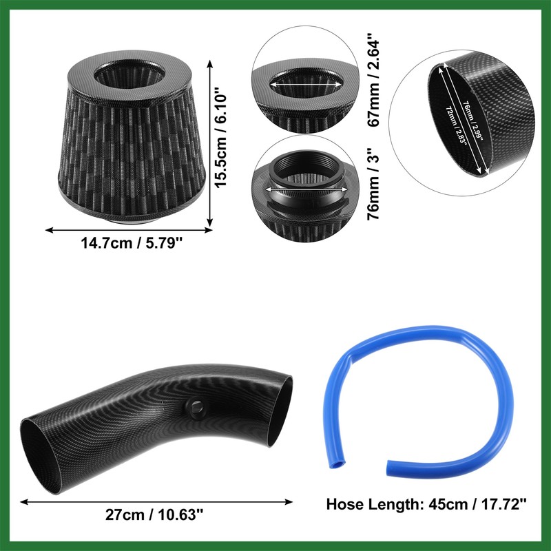 - Accurate: [Size] Air Filter Dimension: 15.5x14.7cm / 6.10"x5.79"(D*H), Air Filter Hole Diameter 1: 67mm / 2.64", Air Filter Hole Diameter 2: 76mm / 3", Intake Air Pipe Length: 27cm / 10.63", Intake Air Pipe Inner Diameter: 72mm / 2.83", Intake Air Pipe Outer Diameter: 76mm / 2.99", Comes with 2 aluminum mounting clamps for installation.