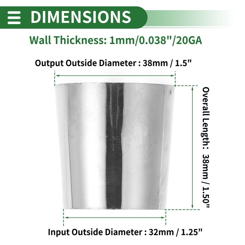 - Feature:Pipe Type: Input Outside Diameter: 38mm / 1.5"; Output Outside Diameter: 38mm / 1.5"; Overall Length: 38mm / 1.50"; Wall Thickness: 1mm/0.038"/20GA